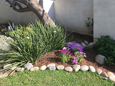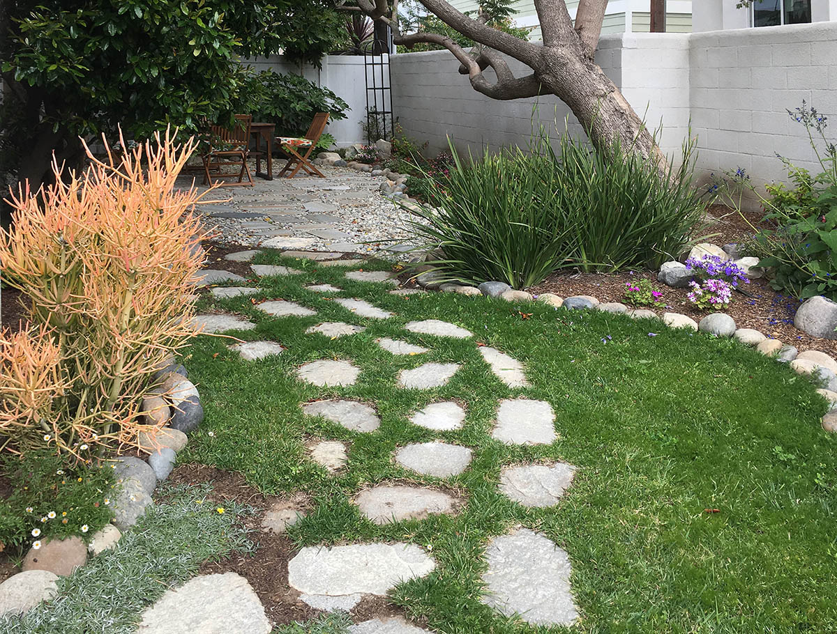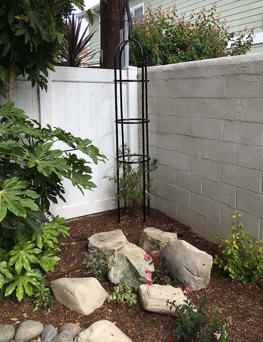 The garden was in such bad shape that I needed to do something drastic. Even before all of the disasters, I knew I had clayey soil. For the first time, I decided to hire someone to help me. I contracted Denise and Randy, who were very helpful. They made some suggestions on what to do about the drainage problem, and recommended using gravel and pavers in the area that no longer had grass. Denise offered information on how to amend the soil, and what plants to consider. After the French drain was installed, they arrived. They worked on getting rid of the few weeds in the newly designated patio area and applying gypsum to the soil . Next they installed the gravel and pavers. They found some gorgeous river rocks for bed edging, and tons of plants! It was so exciting to see the rows of pots of plants in that sad garden. When they were finally in the ground, suddenly the yard started filling up with painted lady butterflies (by chance, there were thousands of them here because of all the rain). Then the bees came, and other creatures. The new garden was like a Phoenix arising from the ashes.