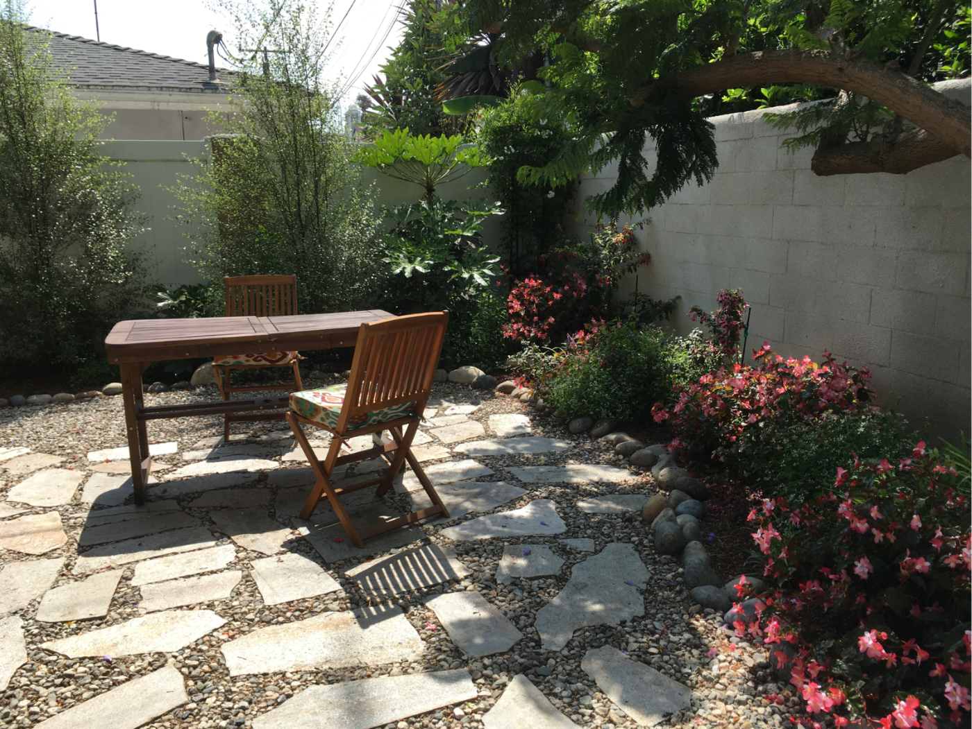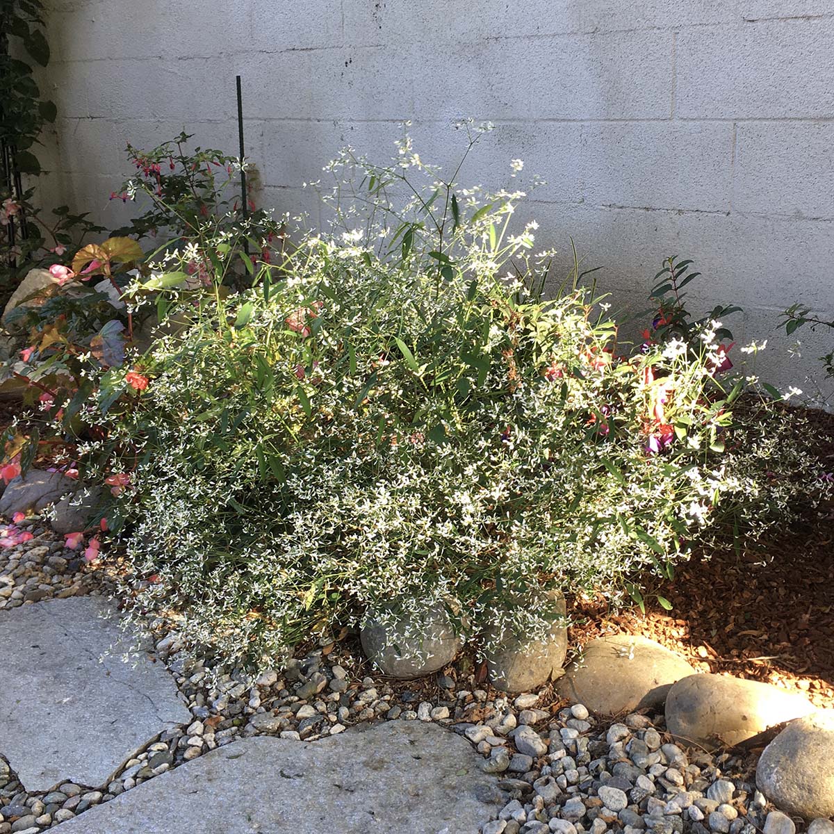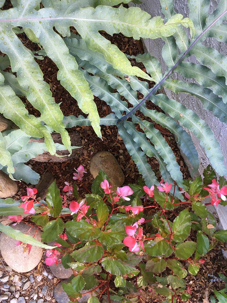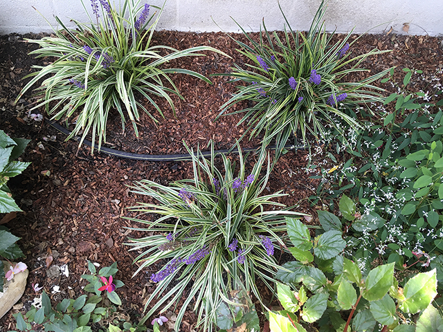 All in all, the garden is thriving. Some plants didn't enjoy where they were located: the delphiniums bloomed twice and died. The salvia planted in deeper shade gradually shrivelled up. But the begonias and most of the fuchsias did well. The pittosporum "Silver Sheen" has grown quite tall, and the star jasmine and potato vines are climbing higher. The invasive pepper tree had to go, and there are two new "Silver Sheens" instead. Also new to the garden are several liriope plants.